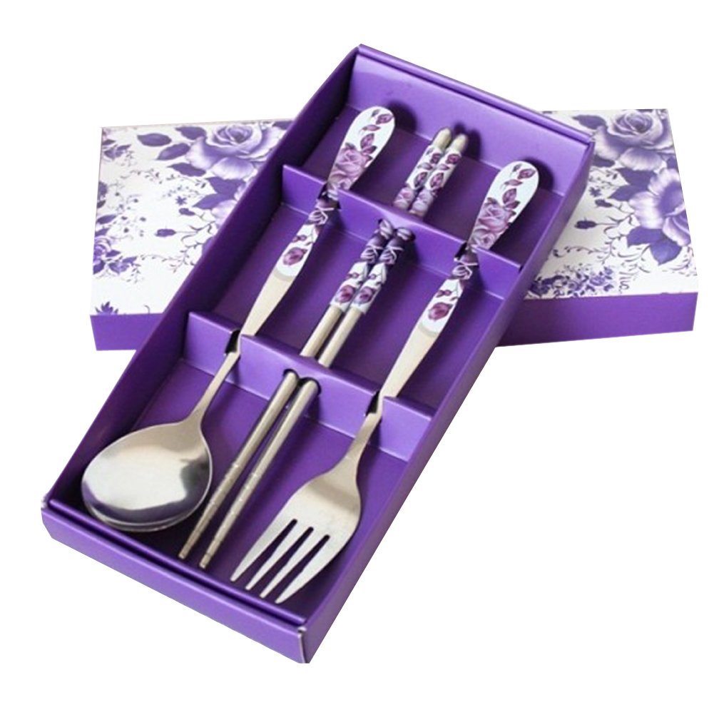 [03/21/2015] 浪漫紫玫瑰不鏽鋼筷子+湯匙+叉子組,Romantic Rose Stainless Steel Metal Chopsticks Spoon and Fork Set,漂亮的餐具用起來心情特別好,請朋友到家裡吃飯也很體面,目前價格 $8.99 USD。免運費。哪裡買: amazon。
