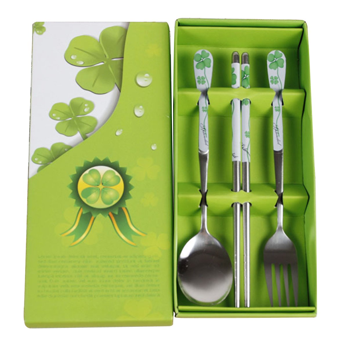 [03/21/2015] 幸運草不鏽鋼筷子+湯匙+叉子組,Metal Stainless Steel Chopsticks Spoon and Fork Set Green Lucky Four Petal Flower Design with Stylus,漂亮的餐具用起來心情特別好,請朋友到家裡吃飯也很體面,目前價格 $7.99 USD。免運費。哪裡買: amazon。