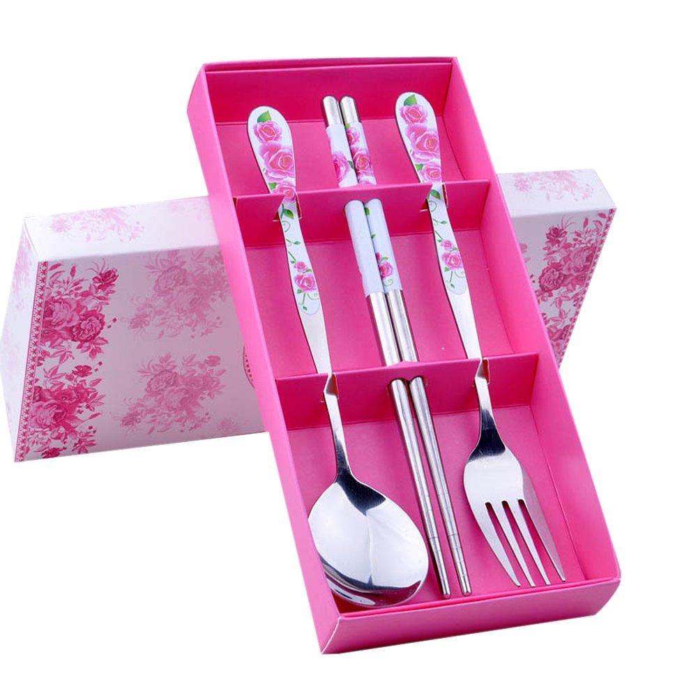 [03/21/2015] 浪漫玫瑰不鏽鋼筷子+湯匙+叉子組,Romantic Rose Stainless Steel Metal Chopsticks Spoon and Fork Set with Stylus Pink,漂亮的餐具用起來心情特別好,請朋友到家裡吃飯也很體面,目前價格 $8.99 USD。免運費。哪裡買: amazon。