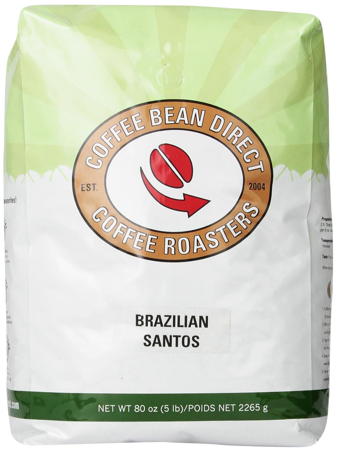 [05/05/2015] 多款Coffee Bean Direct 大包裝咖啡豆有額外$5USD 折價券可以使用,上圖,巴西咖啡豆,Coffee Bean Direct Brazilian Santos, Whole Bean Coffee, 5-Pound Bag,五磅包裝,定價$41.28,如果選擇 Subscribe and Save 最多可以再八五折折扣,全部折扣後只要 $41.28 – $5 ($5 off Coupon) – $6.19 (15% off Subscribe & Save) = $30.09 USD。平均一磅只要$6 USD。免運費。哪裡買:amazon。