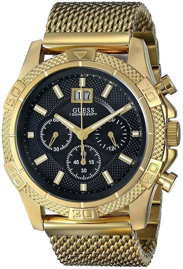 [09/13/2015] GUESS U0205G1 金色不鏽鋼男表,GUESS Men’s U0205G1 Mesh Gold-Tone Chronograph Watch,防水100公尺,評價非常好,定價$235, 特價 $131.60 USD。境內免運費. 哪裡買:amazon。