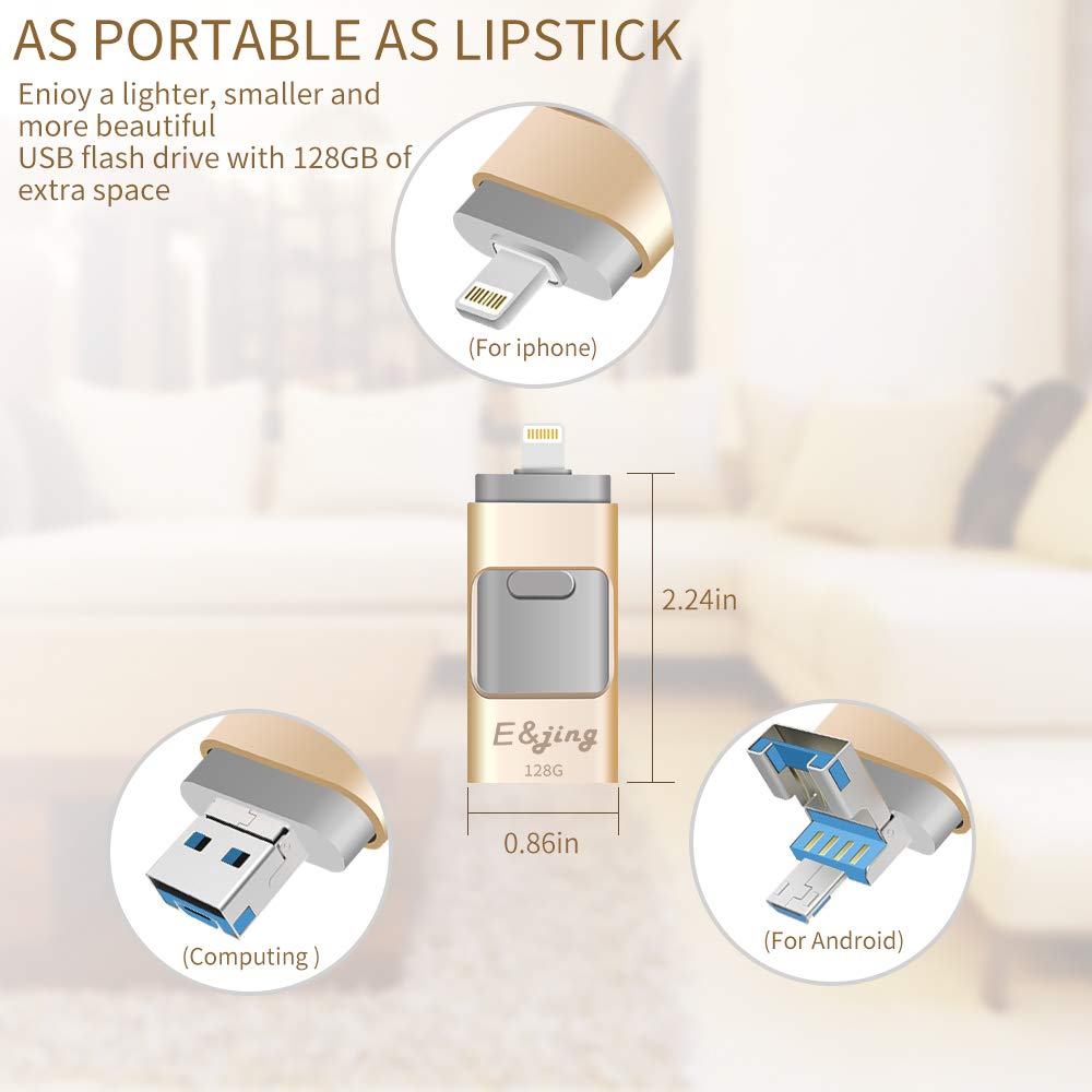 [07/05/2019] E&jing iPhone Flash Drive 128GB 三合一隨身碟,USB Flash Drive for iPhone_ E&jing iPhone Flash Drive 128GB iPhone External Storage USB 3.0 photostick Mobile for iPhone,Android,PC Photo iPhone Picture Stick(Gold),容量128GB,特價$22.98, 使用折扣碼 HEURPF8C 之後, 價格降為$13.79 USD。境內免運費 (學生可以免費試用Prime)。哪裡買: amazon。