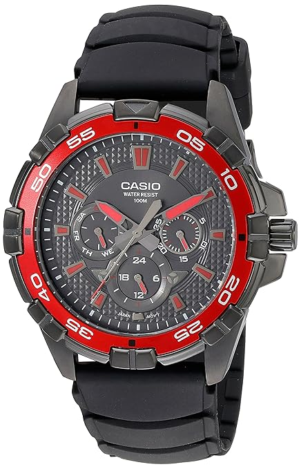 [04/16/2015] Casio MTD1069B-1A2 系列男用電子表,Casio Men’s MTD1069B-1A2 Round Analog Black and Red Dial and Black Resin Strap Watch,全新,定價$120,目前特價$62.40 USD。Prime境內免運費。哪裡買:amazon